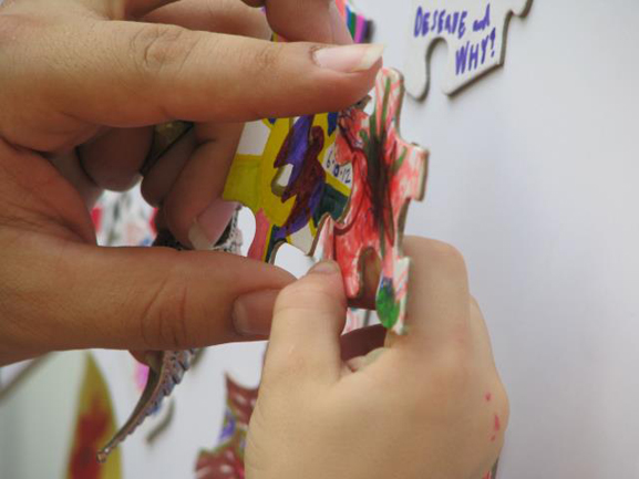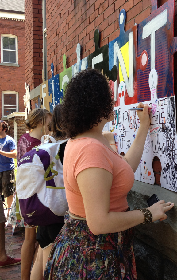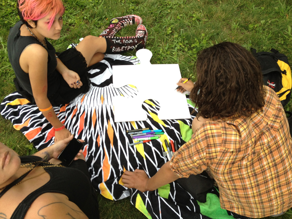The Puzzle Project was one of more than 200 artists and performers on Governors Island on June 9th & 10th. Thousands of spectators viewed the puzzle installation at Figment and more than a hundred new pieces were created on blankets under a tree on the big lawn across from our puzzle exhibit tents. It was really cool.