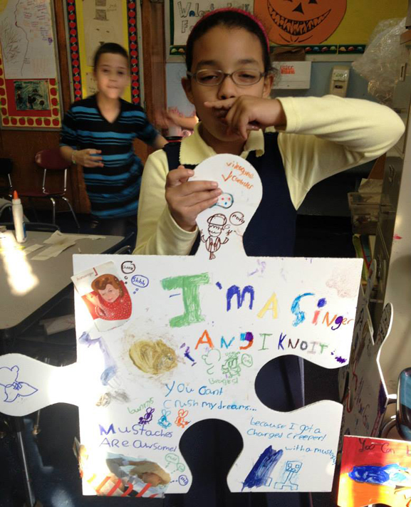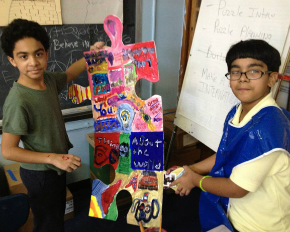 As the PS16 art teacher, Tim is able to work closely with each artist. Many have never considered how to make meaningful artwork. One student said out loud, "I never thought of who I am". This amazing little school in Williamsburg, Brooklyn has some really talented young artists. Big thanks to Principal Renny and the amazing staff and PTA for helping the puzzle project grow (and having fun making puzzle art together).