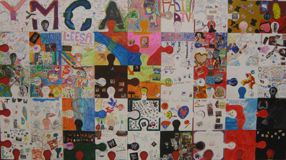 On Thursday, March 11th we assembled all of the YMCA puzzle pieces together as a sub-installation for the 2010 Strong Kids Kickoff event. The result was over 50 feet of jigsaw puzzle art.
